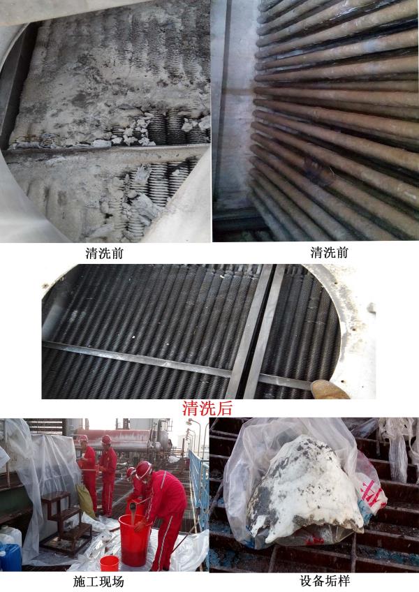 復(fù)合型蒸發(fā)式冷卻器上部是風(fēng)冷式,下部為水冷式。因此上部翅片管束表面由于接觸環(huán)境大氣、易于積存油膩、塵垢、煙垢、柳絮等附著物,形成較大的熱阻,污垢的存在將大大降低甚至喪失鋁翅片冷換設(shè)備的冷卻作用。另外鋁翅片表面的污垢也會促使垢下腐蝕。下部水冷式光管表面由于外部環(huán)境條件影響,并且由蒸發(fā)式空冷器的特點,造成循環(huán)冷卻水濃縮快,濃縮倍率高,硬度,堿度高,濁度高等困難。在長期運行過程中,空冷器光管束表面生成了很厚的硬垢,嚴(yán)重影響了空冷器換熱效果,增加了能耗,影響了正常生產(chǎn)和安全。為了保證設(shè)備安全,穩(wěn)定運行,延長使用壽命,提高冷卻效率,應(yīng)對其進(jìn)行定期清洗。