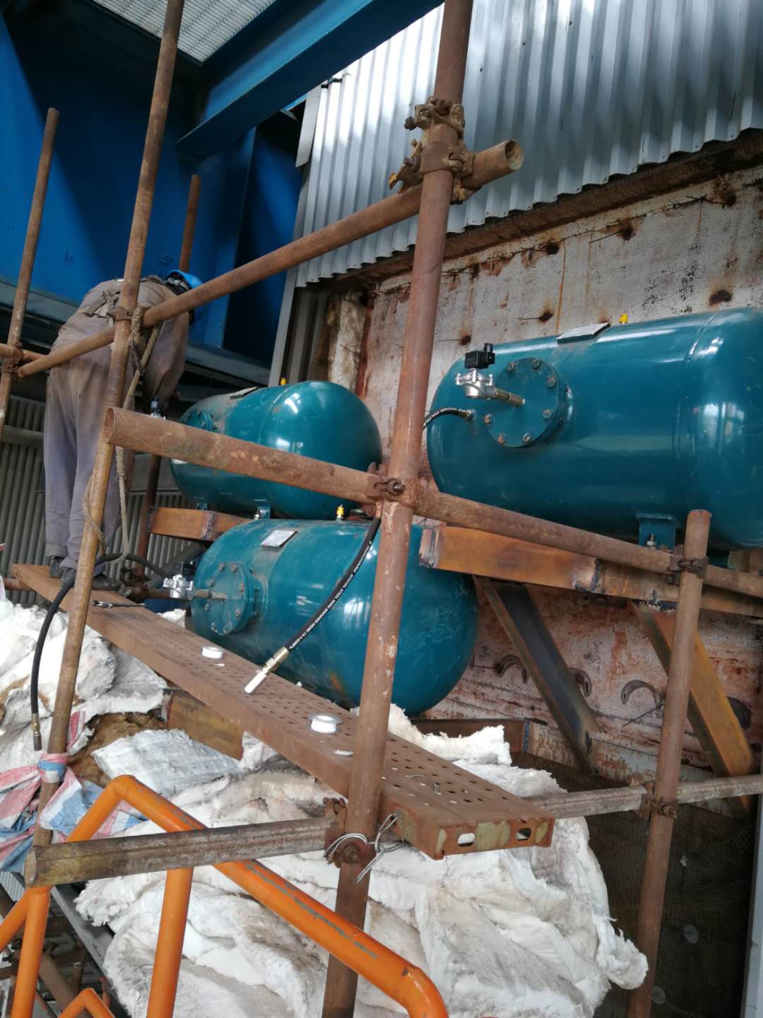 瀘州電廠脫硫改造項目設計空氣炮型號為KQP-B-300L,數(shù)量96臺,噴嘴口徑為108耐高溫鑄造鴨嘴形噴嘴,配置控制箱為自動不銹鋼雙開門,配套單向閥,油水過濾器。我公司與河南翔龍工程集團有限公司(空氣炮安裝),受現(xiàn)場空間限制空氣炮噴管加長5米到6米左右。安裝完成后現(xiàn)場調(diào)試一次驗收合格。